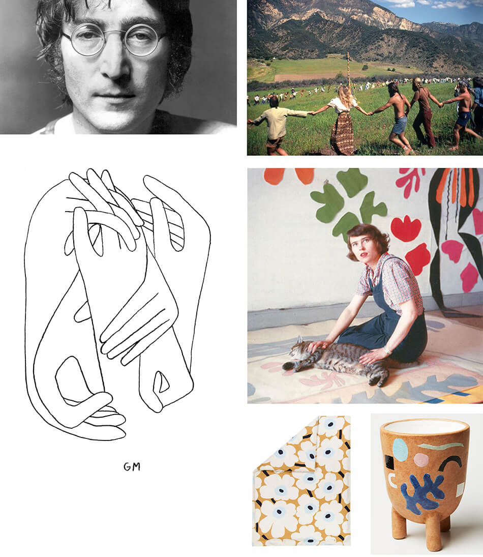 top left to bottom right: 1. john lennon, his music, found on gannett-cdn.com 2. together in a field, sun, moon and stars above us, surrounded by mountains, moving together, found on weheartit.com 3. Beautiful, simple drawing that says it all geoffmcfetridge.tumblr.com 4. Matisse cut-outs Annelies Nelck found on moma.org 5. The designs of Marimekko Unikko, this print found on livingbydesign.net.au 6. Matisse style Footed Vase, love the colour & shapes, found on maisyandco.com.au